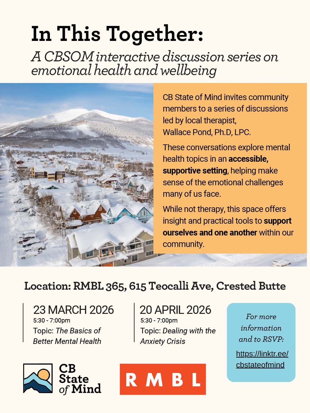Sessions will take place at RMBL 365 (615 Teocalli Ave) in Crested Butte from 5:30–7:00 p.m. on March 23, 2026, featuring “The Basics of Better Mental Health,” and April 20, 2026, focusing on “Dealing with the Anxiety Crisis.” For more information and to RSVP, visit https://linktr.ee/cbstateofmind