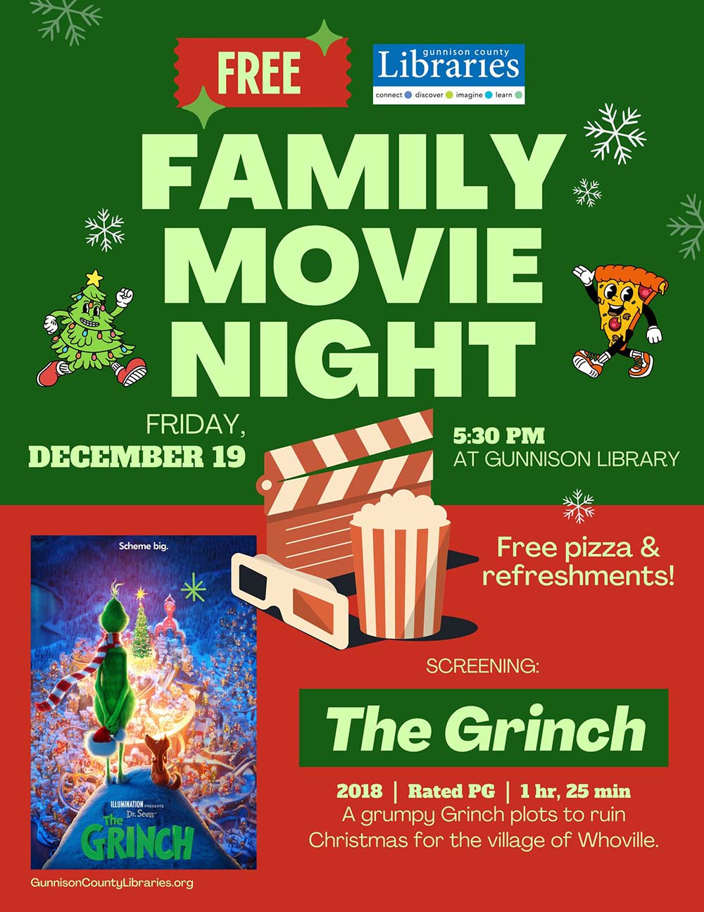 Please join us at 5:30 pm at the Gunnison Library on Friday, December 19 for a FREE screening of The Grinch (PG – 2018).