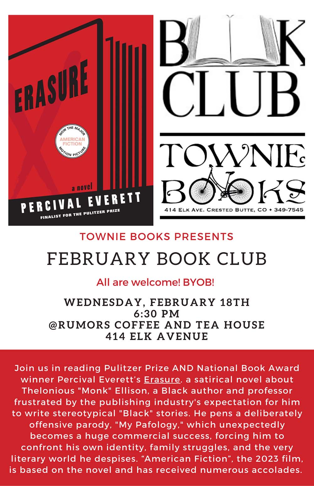 Join us in reading and discussing Percival Everett’s blistering satire about race and writing, Erasure. We’ll meet at the shop on Wednesday, February 18th at 6:30 p.m.