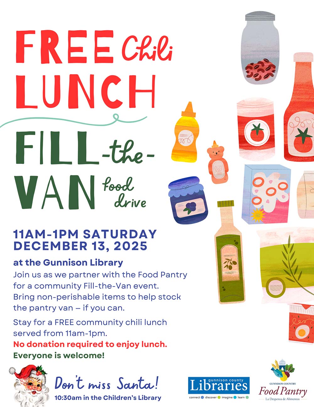 Please join us at the Gunnison Library on Saturday, December 13 from 11am-1pm for a FREE chili lunch and Fill-the-Van food drive for the Gunnison Food Pantry.