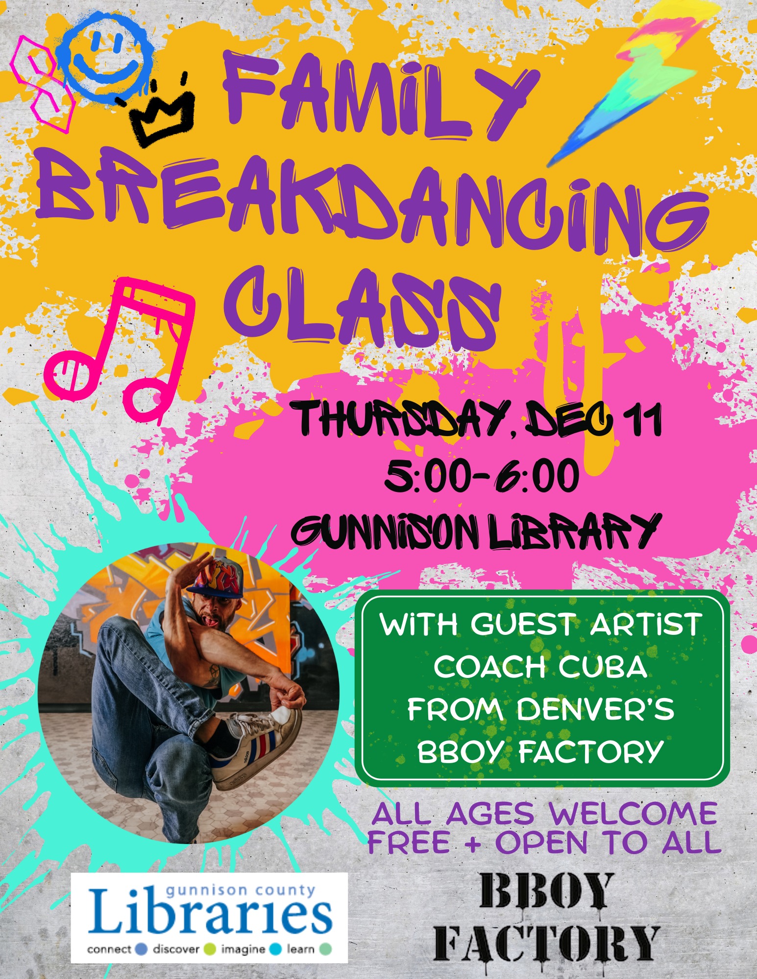 Please join us at 5 pm at the Gunnison Library on Thursday, December 11 for a Family Breakdancing Class.