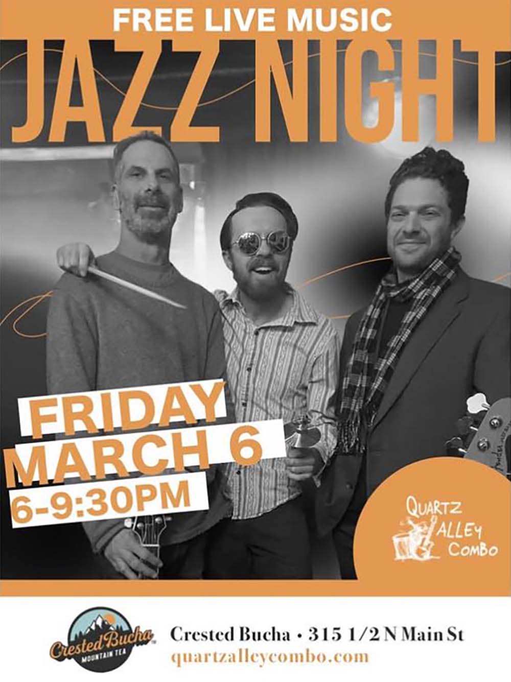 Catch Quartz Alley Combo live at Crested Bucha on Thursday, January 30, 2025, at 6:00 PM for an evening of smooth, groove-forward jazz in a laid-back Gunnison setting.