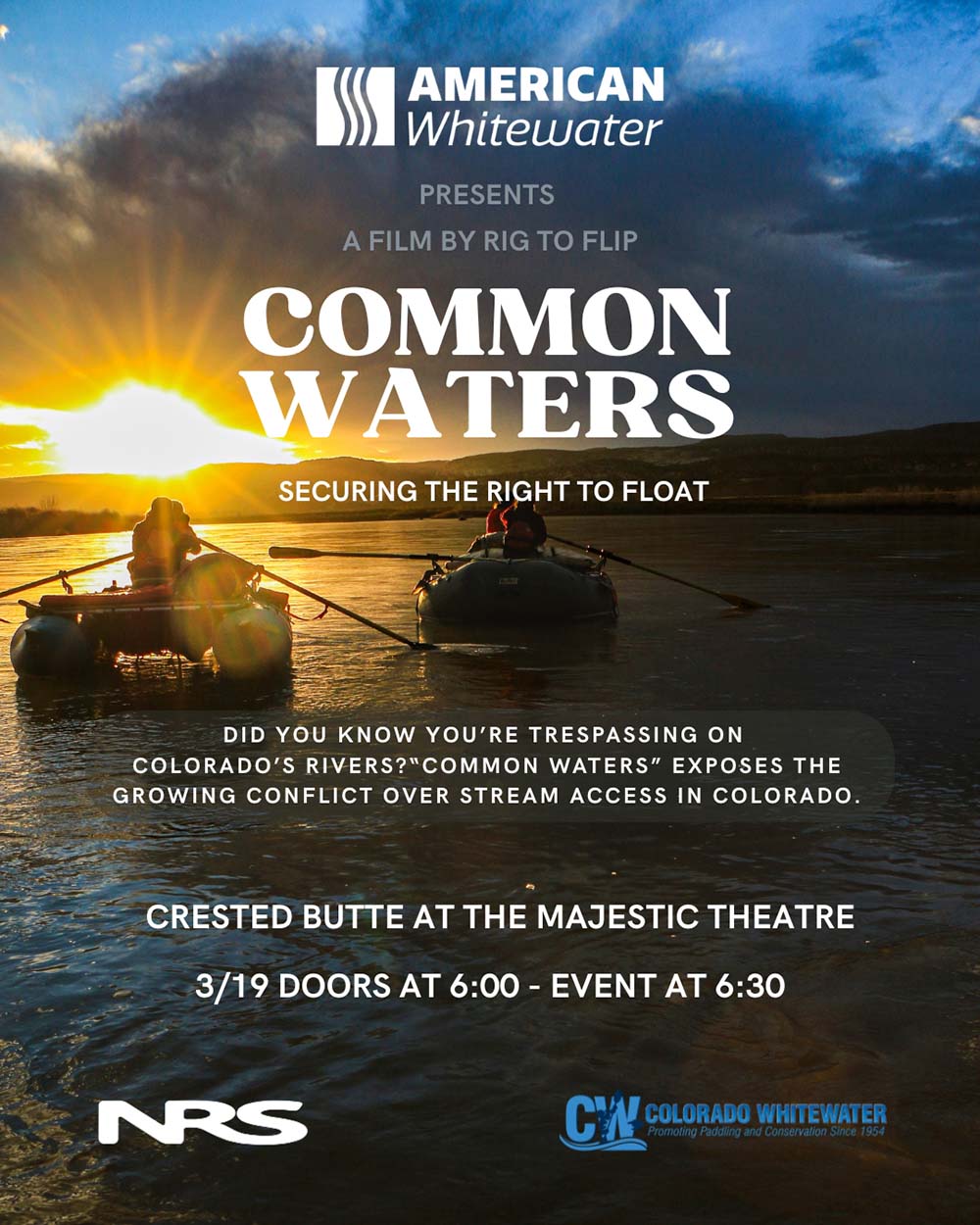 The new film, Common Waters, is out. Join us for this exclusive showing in Crested Butte at the Majestic Theatre. American Whitewater is working with the Responsible River Recreation Alliance to pass legislation in Colorado to ensure the right to float, scout, and portage. Moneyed interests are pushing for the status quo which defines floating on rivers that flow through private property as trespass. That means just a few, wealthy landowners could completely block public access to your favorite runs around the state. This could happen tomorrow, this could happen at any moment. We need your help and your voice to push for change that reflects the values of our communities.