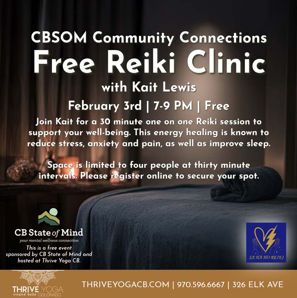 This Free Community Connections event is sponsored by CB State of Mind and Hosted at Thrive Yoga CB