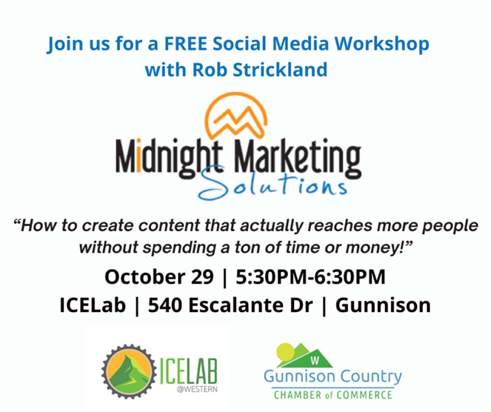Join us October 29 from 5:30-6:30PM at the ICELab for a FREE Social Media Workshop with Rob Strickland of Midnight Marketing Solutions.