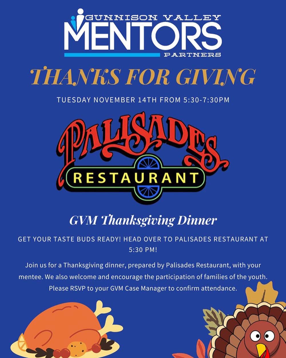 Join Gunnison Valley Mentors for a Thanksgiving dinner, prepared by Pallisades Restaurant, with your mentee.