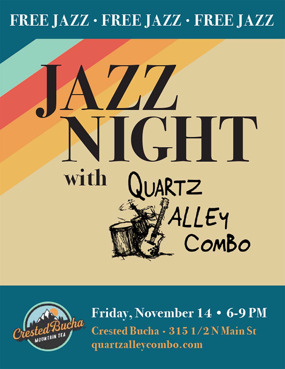 Join Quartz Alley Combo for an improvisational jazz experience featuring a range of styles, including Swing, Latin, Funk, Cool Jazz, and Bebop, along with great kombucha.