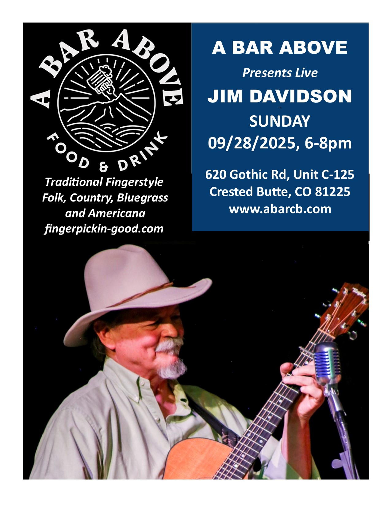 Jim Davidson returns to A Bar Above in Mt Crested Butte, CO from 6pm to 8pm on Sunday, 09/28/2025.