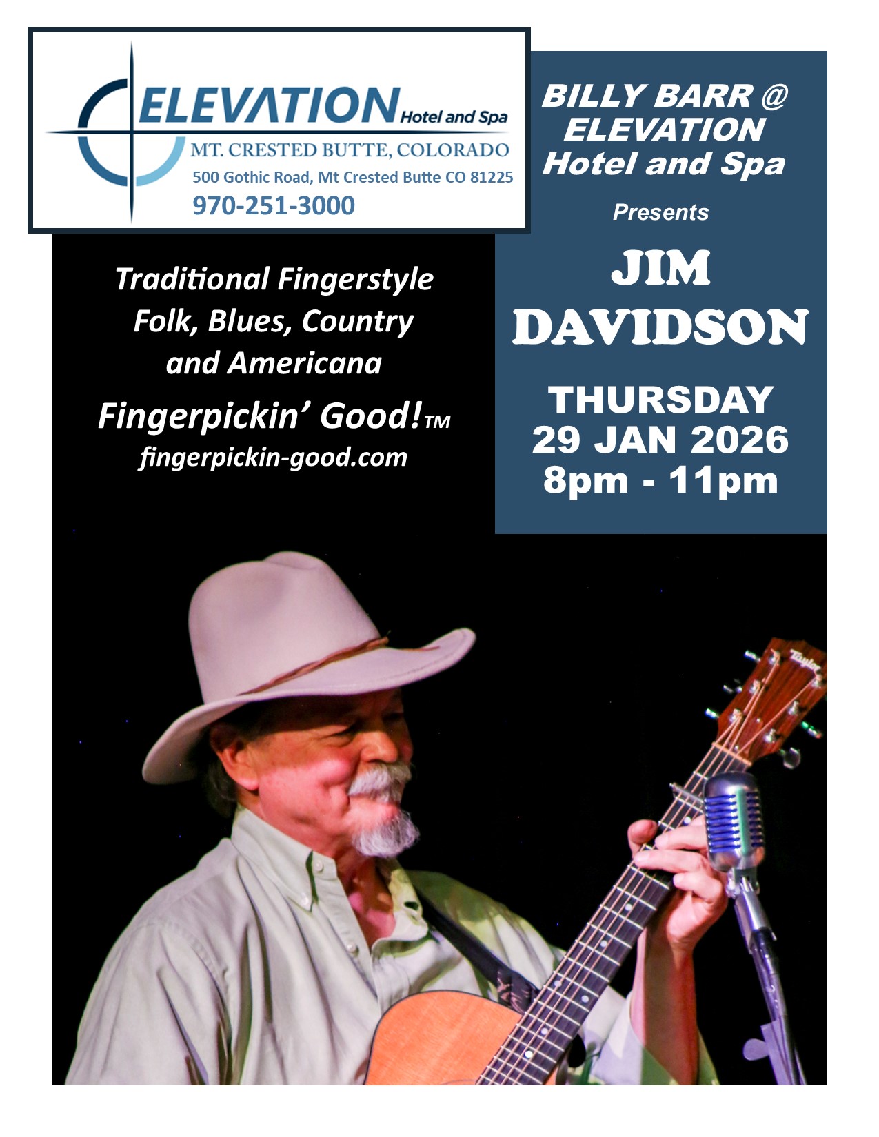 Join Jim Davidson at billy barr in the Elevation Hotel & Spa in Mt Crested Butte, CO from 8pm to 11pm.