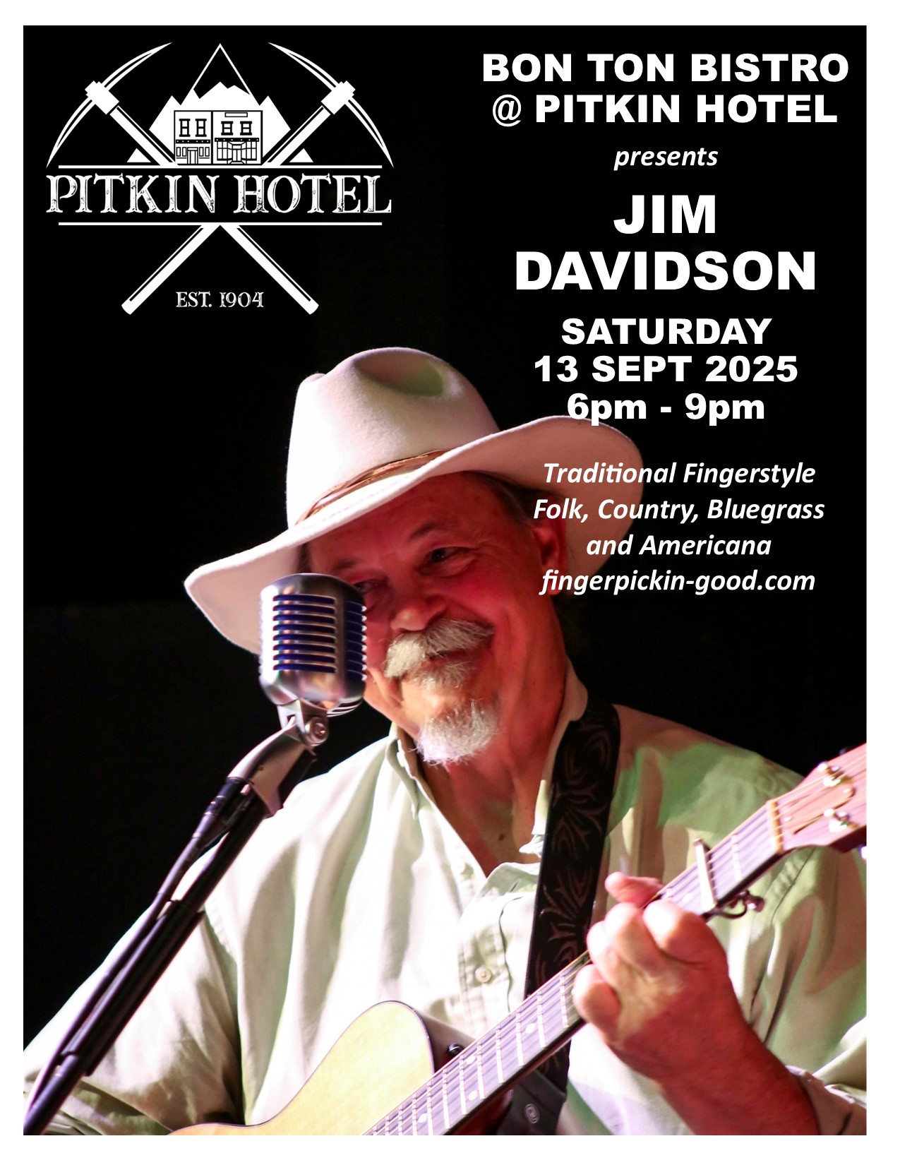 Jim Davidson performs at the Bon Ton Bistro located in the Pitkin Hotel this Saturday, 13 September 2025, from 6pm to 8pm.