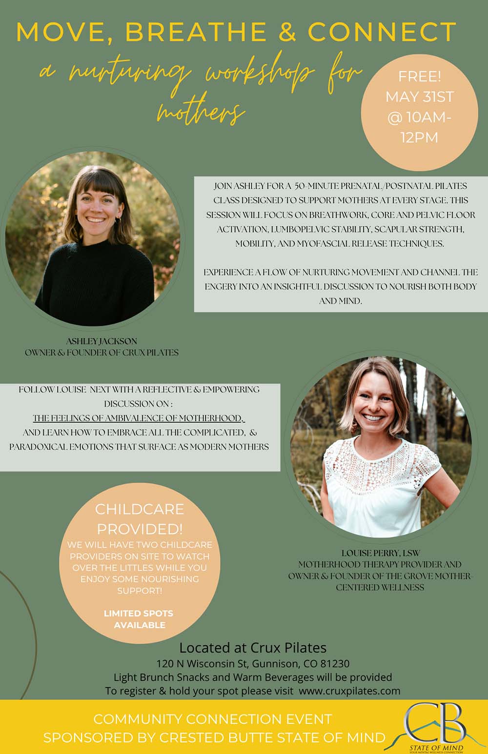 This beautiful offering is sponsored by @cb_state_of_mind. The workshop is free, and childcare is available along with a breakfast snacks will be provided! Register at https:// cruxpilates.com/schedule