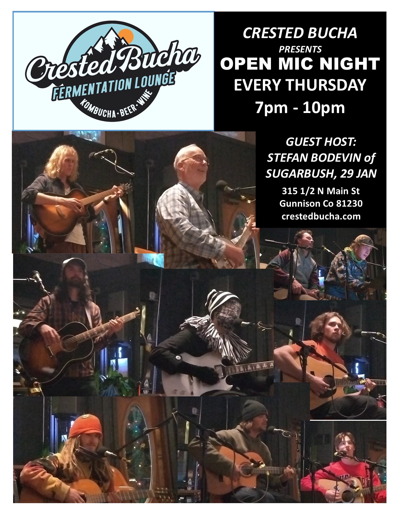 Join guest host Stefan Bodevin of Sugarbush for Open Mic Night at Crested Bucha in Gunnison, CO from 7pm to 10pm.