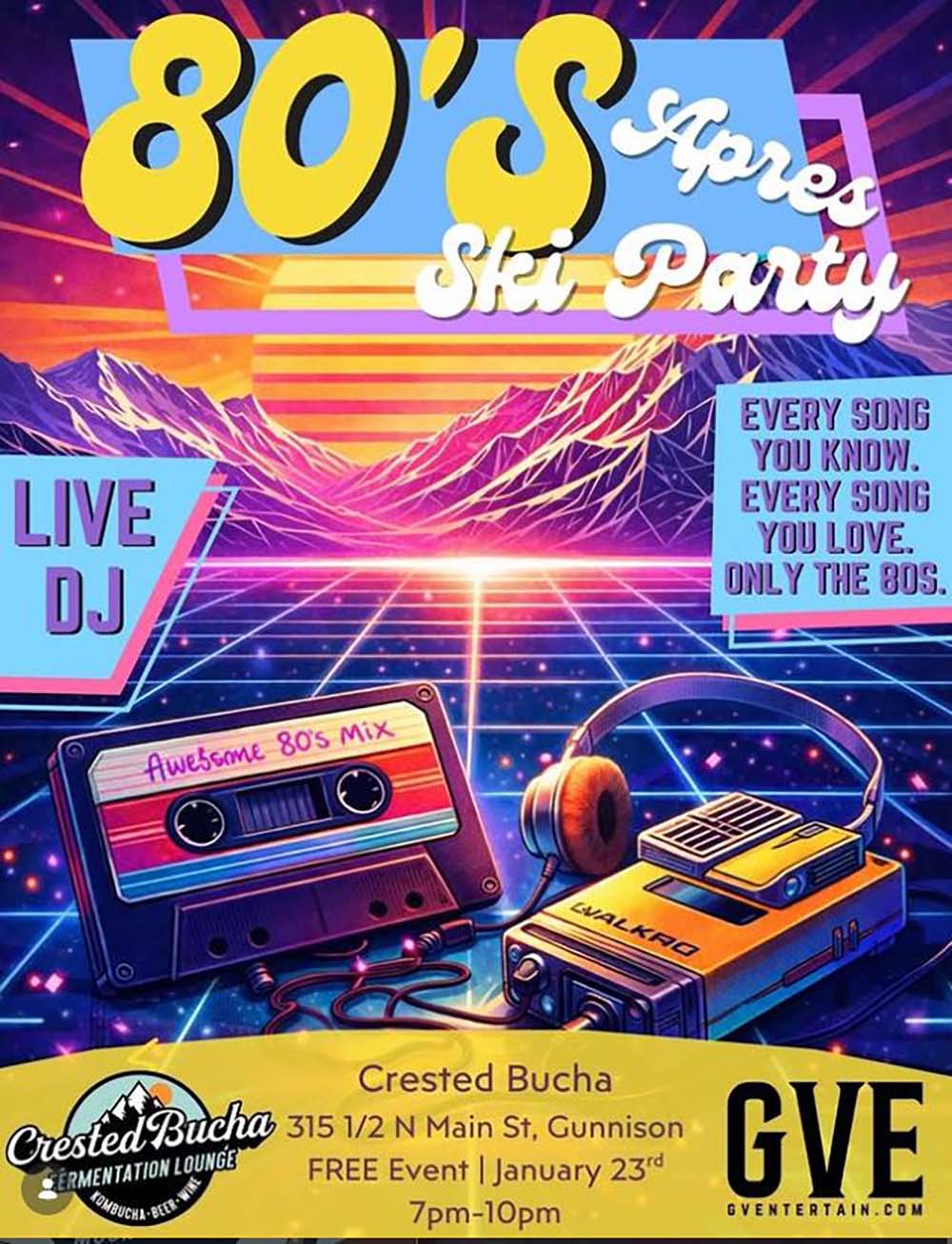 Break out the neon, one-piece suits, and retro goggles for an 80’s Après Ski Party at Crested Bucha on January 23rd, 2026.