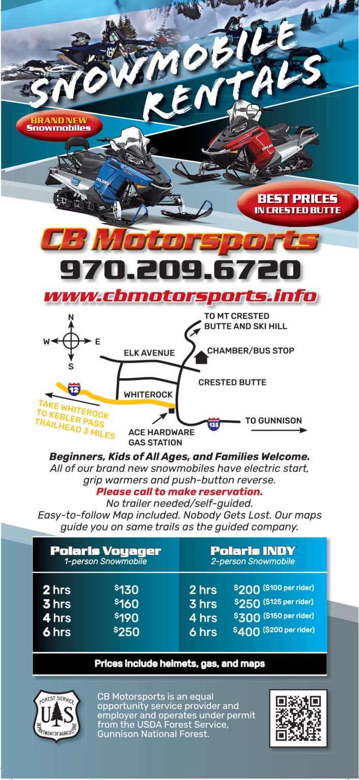 2-3-4 and 6 hour self guided tours (see flyer below) in the Kebler Pass area. Beginners and families welcome. All snowmobiles have electric start, grip warmers and push button reverse.