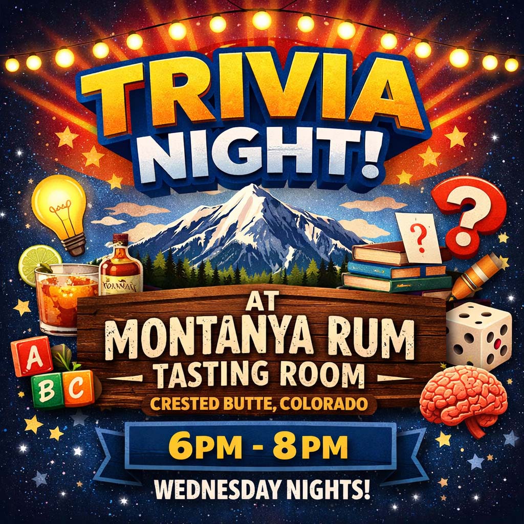 Join us for an unforgettable Trivia Night at the Montanya Tasting Room, hosted by the high-energy team at Quiz Quiz Bang Bang.