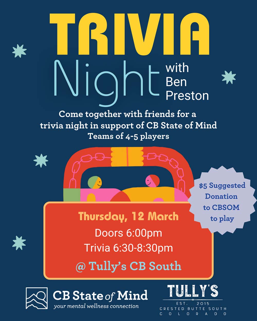Doors open at 6:00 p.m., with trivia running from 6:30 to 8:30 p.m., and a $5 suggested donation helps support CBSOM’s mental wellness programs.